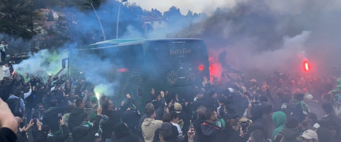 Interdits de déplacement en terre lyonnaise à l'occasion du derby, plus de 2000 supporters stéphanois se sont réunis à L'Étrat pour encourager leur équipe lors du départ du bus.