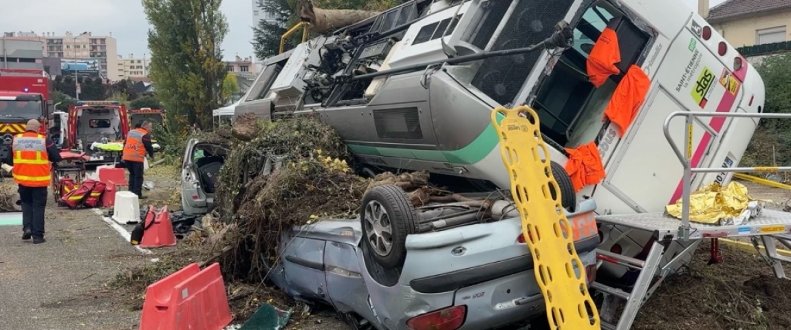 Rue Gutenberg, dans le quartier de La Rivière à Saint-Étienne, la scène pourrait être sortie d’un film catastrophe. Voitures et poids lourds accidentés, victimes coincées sous des épaves… Les sapeurs-pompiers plongent au cœur du chaos pour sauver des vies, appuyés par le SAMU, des chiens de recherche et des drones.