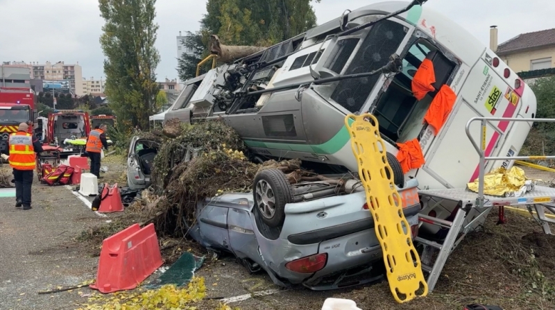 « Ici, c'est le scénario d'un accident routier grave, avec des engins lourds accidentés, avec des gens bloqués encore sous des épaves », explique le Capitaine Julien Chopy, référent de l’unité de sauvetage appui et recherche. « On a là une cinquantaine de sapeurs-pompiers qui travaillent, avec des équipes médicales, du SAMU, des équipes cynophiles et des dronistes. »