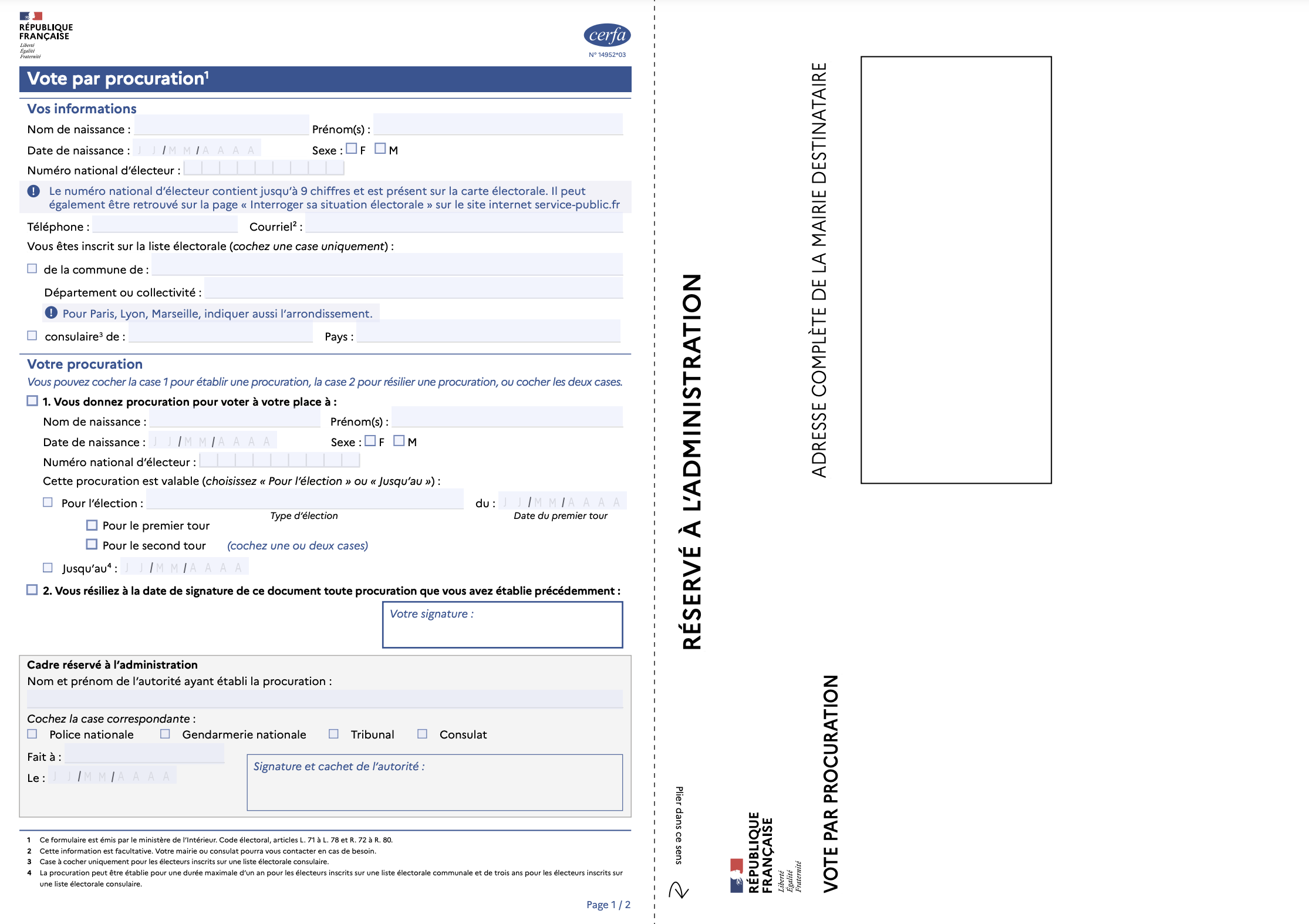Cette solution suit exactement le même principe que la précédente. Il faut aussi remplir une procuration, mais cette fois en papier. Ce document Cerfa est trouvable sur internet (service-public.fr) afin de l'imprimer ou dans les commissariats et gendarmeries. Vous devrez donc remplir toutes vos informations personnelles à la main.
