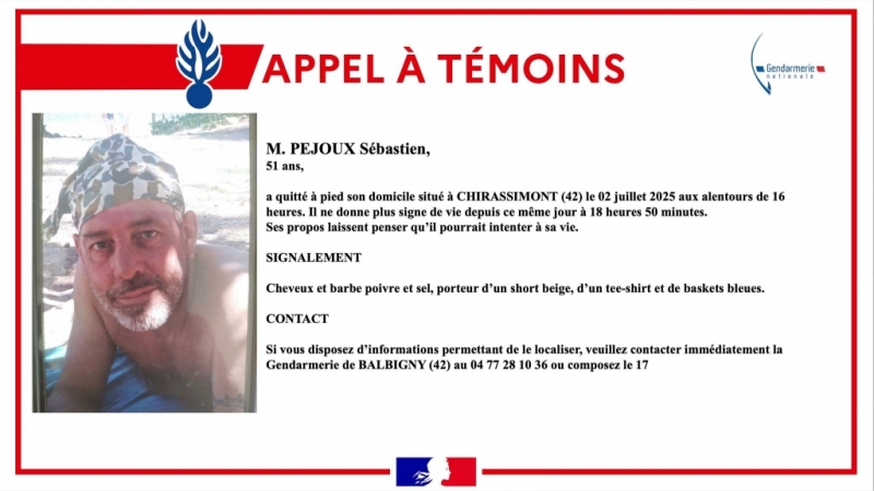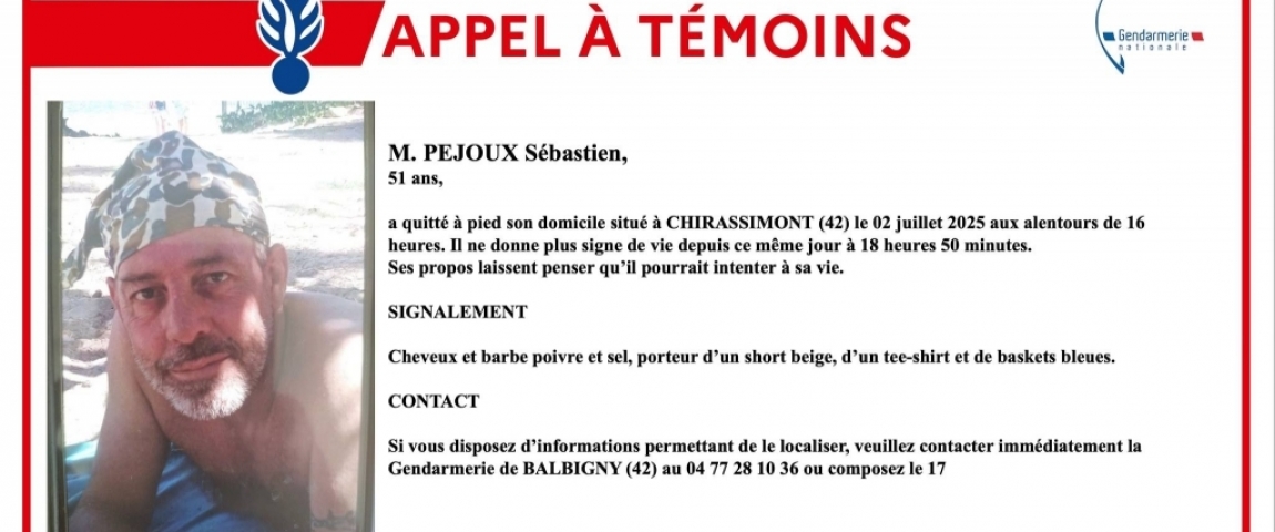 Il a quitté à pied son domicile situé à Chirassimont le mercredi 2 juillet 2025 vers 16h, et n’a plus donné de signe de vie depuis 18h50.