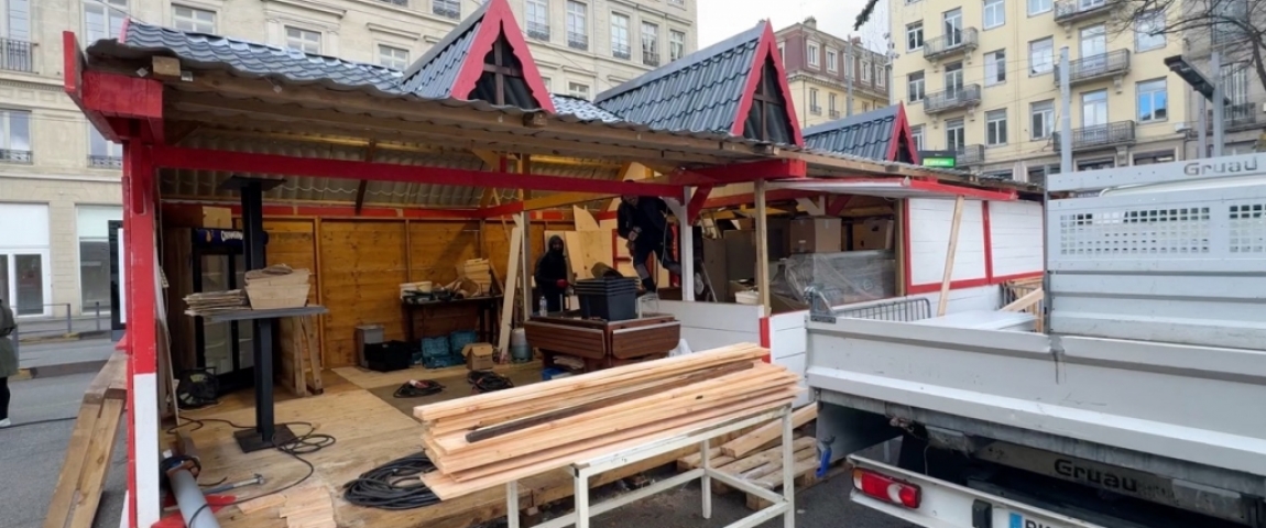 À Saint-Étienne, la place de l’Hôtel-de-Ville bruisse d’activité. Ce jeudi matin, à la veille de l’ouverture du marché de Noël, les commerçants enchaînent les derniers réglages. Pour certains, c’est même l’heure de jouer les apprentis menuisiers. C’est le cas d’Étienne Darinot, co-fondateur de la Brasserie des Plantes, occupé à ajuster les étagères de son chalet : « Nous, on est artisans licoristes, pas menuisiers », sourit-il, outil à la main. « Mais il faut que tout soit prêt pour accueillir les gens dans de bonnes conditions. »