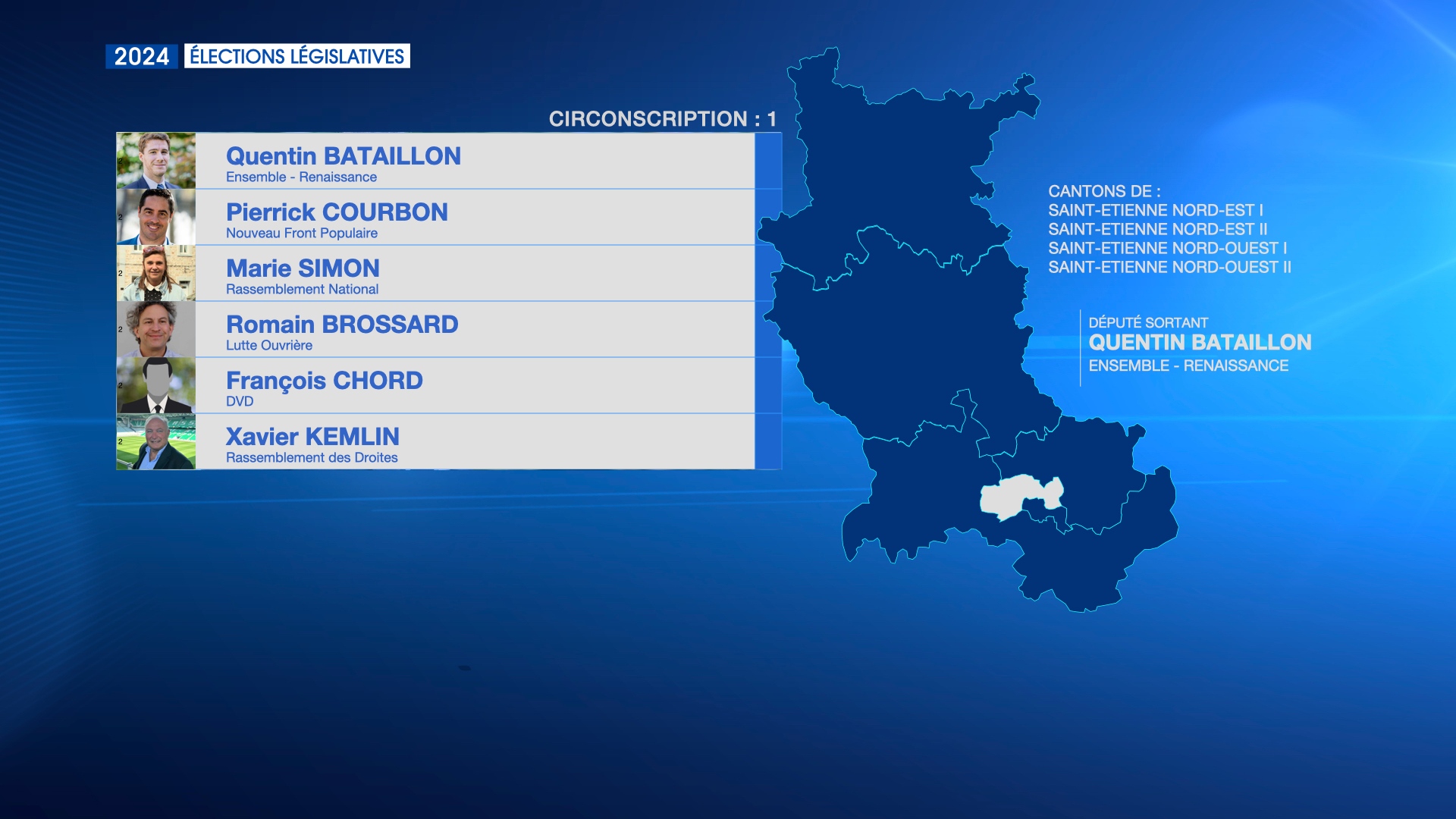 L’absence de Laetitia Copin est la surprise de cette première circonscription de la Loire. La candidate NUPES en 2022 avait fini deuxième du premier tour. Elle a été remplacée en 2024 sous le nouveau front populaire par Pierrick Courbon. Les piliers de 2022 sont toujours présents, comme Quentin Bataillon, le député sortant, ou encore Marie Simon pour le RN. Xavier Kemlin, l'arrière-petit-fils de Geoffroy Guichard et grand défenseur de Casino, fait lui son apparition dans les bulletins sous la casquette du rassemblement des droites et républicains.