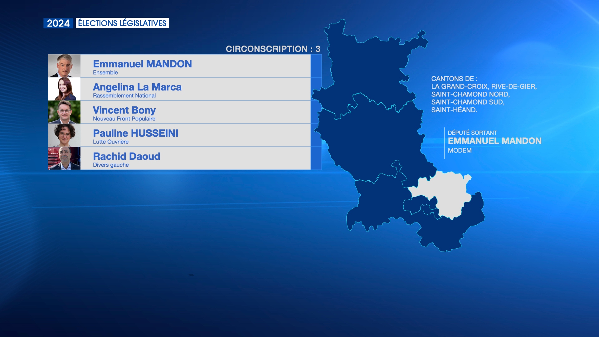 Pas vraiment de surprise dans cette troisième circonscription. Les trois premiers du premier tour de 2022 seront présents pour un match retour : Emmanuel Mandon, député sortant pour Ensemble, Vincent Bony pour le Front populaire, et Angelina La Marca pour le RN. Axel Dugua ne sera pas de la partie en 2024 et aucun candidat de la droite républicaine ne sera représenté. Le petit nouveau, c’est Rachid Daoud, chef d’entreprise dans les transports, et candidat indépendant.