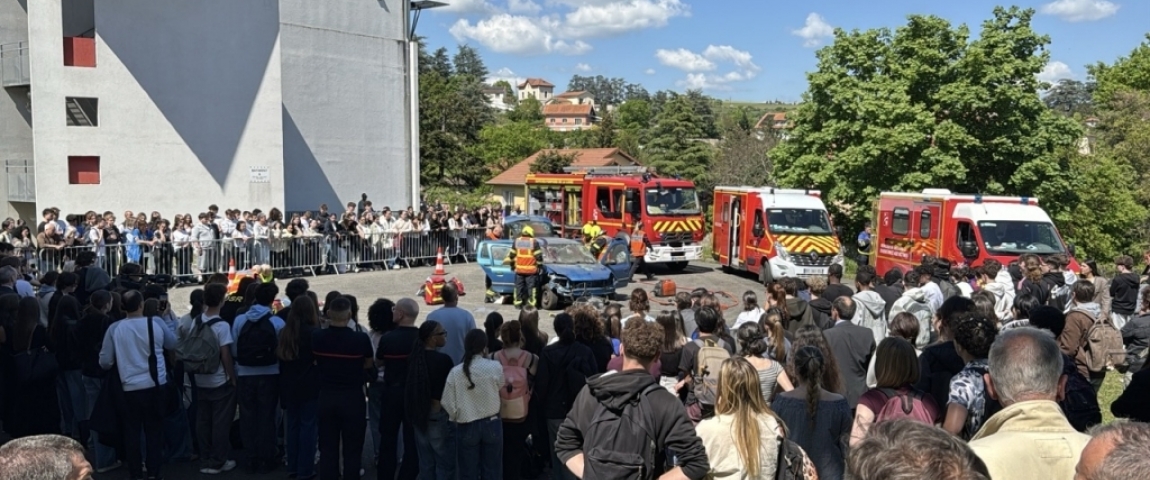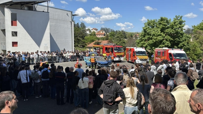 Sirènes, gyrophares, rubalise, acteurs blessés et actions de secours...ce jeudi après-midi, le lycée Georges Brassens de Rive-de-Gier s’est transformé en véritable scène d’accident de la route. Devant les élèves rassemblés, les secours simulent un crash mortel dans des conditions au plus proche du réel.
