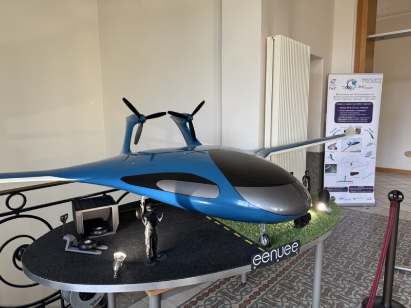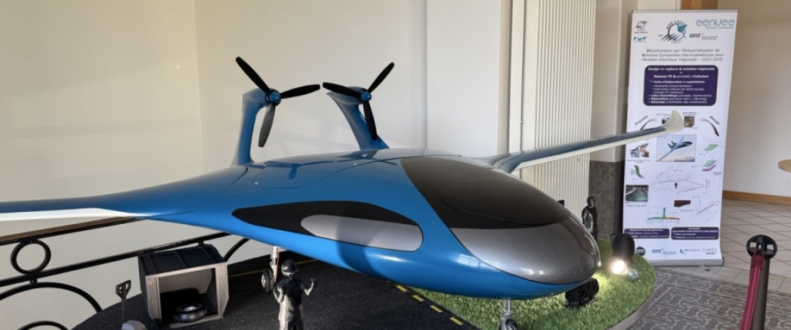 Pour passer du prototype de 4 mètres à un avion de 33 mètres d’envergure, Eenuee s’appuie sur un partenariat avec le LabCom de l’École des Mines. « Nous travaillons sur des matériaux composites pour le fuselage », précise Sylvain Drapier, professeur aux Mines. « Le défit est de mélanger fibre de carbone et résine thermoplastique pour réduire le coûts des contrôles et l’impact environnemental ».