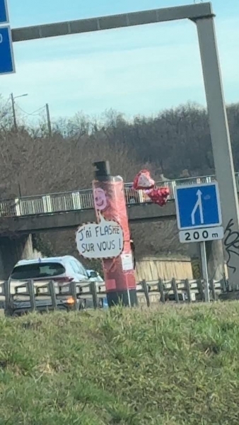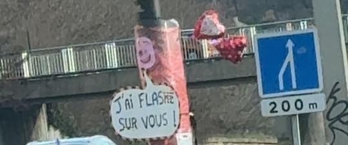 Vendredi 13 février au matin, l’appareil était recouvert d’une bâche rouge, accompagnée de ballons et d’une pancarte affichant le message : « J’ai flashé sur vous ! ». Une décoration humoristique qui empêchait temporairement le radar de fonctionner.