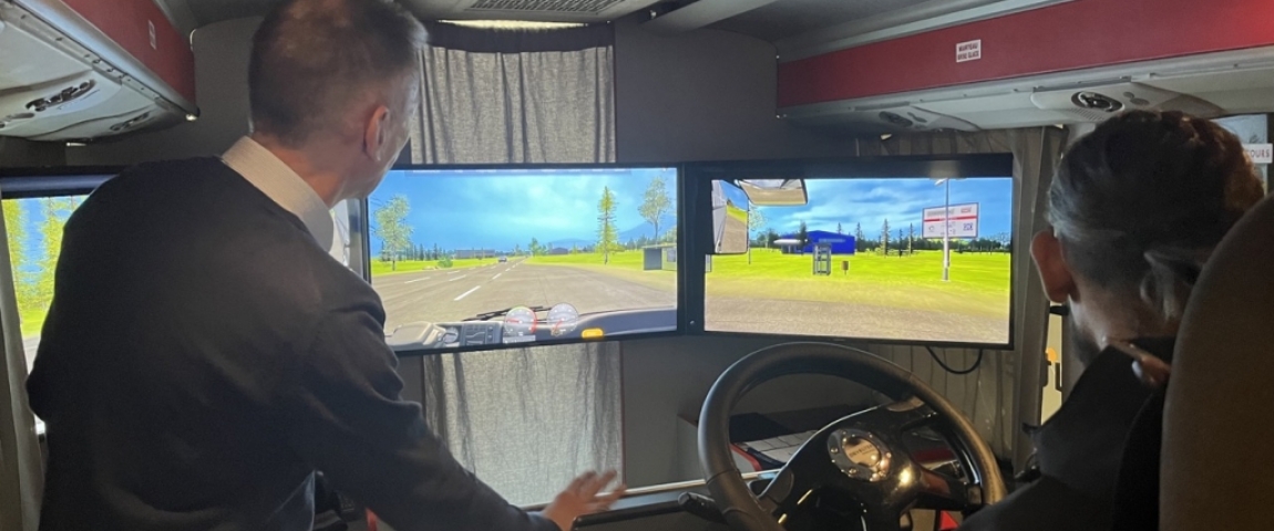 De l'extérieur, il ressemble à un bus tout à fait normal. Mais à l'intérieur, on y retrouve un simulateur de conduite.