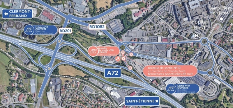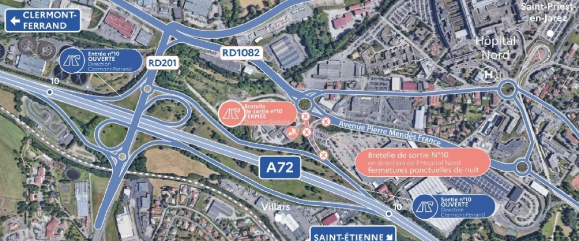 Pour permettre la réalisation de ces travaux dans les meilleures conditions de sécurité, la bretelle de sortie vers la RD 1082 est totalement fermée, de jour comme de nuit, jusqu’au 10 août 2025. Les automobilistes ne pourront pas accéder directement à ce giratoire depuis l’A72. En revanche, les bretelles en direction de l’hôpital Nord et de la RD 201 resteront ouvertes à la circulation. Des itinéraires de déviation ont été mis en place.