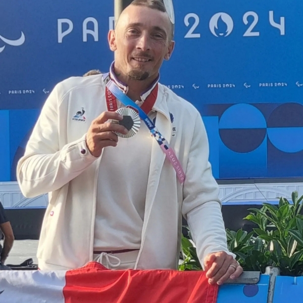 Au lendemain de sa médaille d'argent sur le contre-la-montre, Loïc Vergnaud a de nouveau pris la deuxième place sur la course en ligne (H5), ce jeudi. Il s'agit de sa 5e médaille paralympique de sa carrière. Le para-cycliste ligérien a terminé 2e de la course à Clichy-sous-bois, derrière l'intouchable Néerlandais Mitch Valize qui l'avait déjà devancé sur le contre-la-montre la veille.