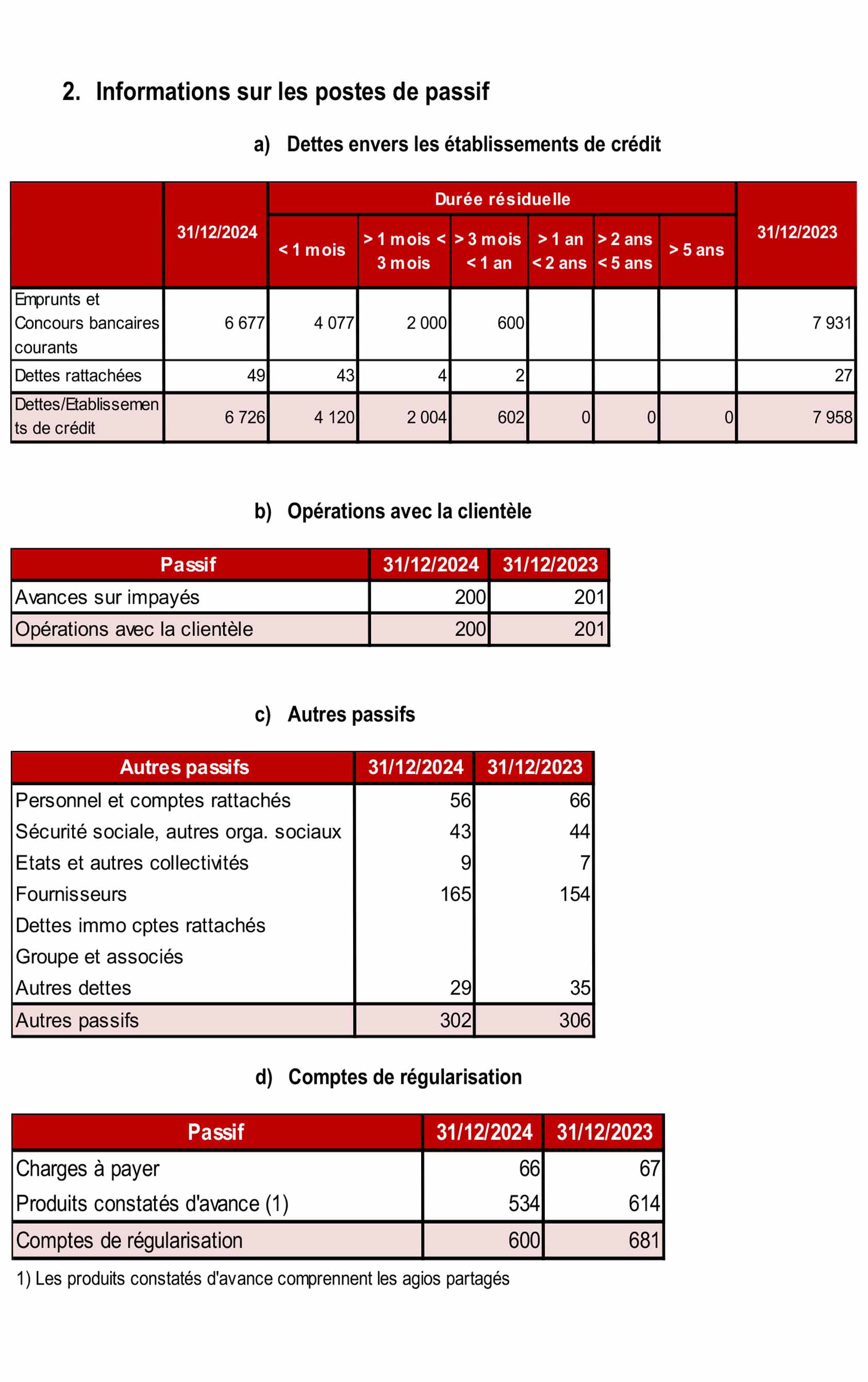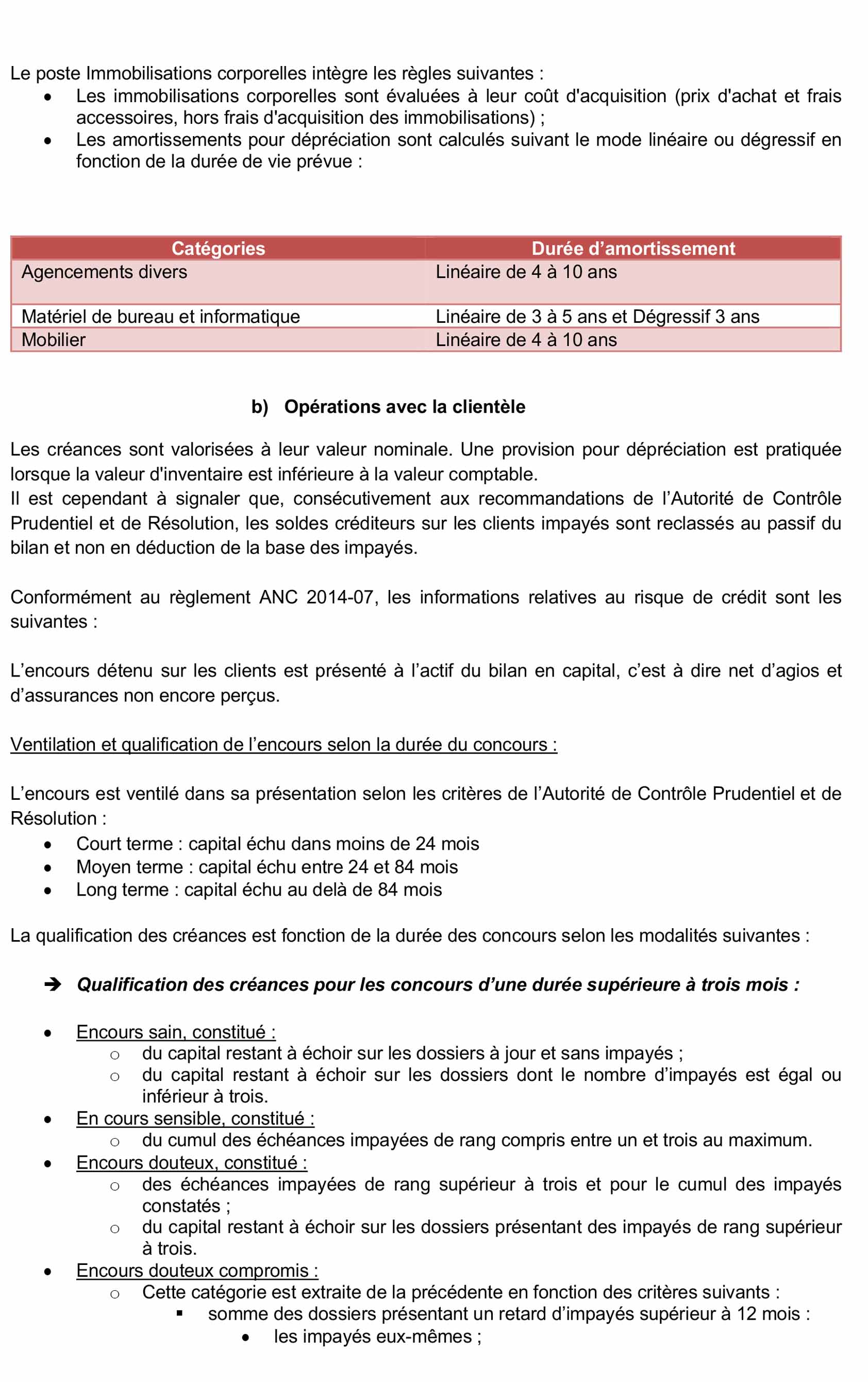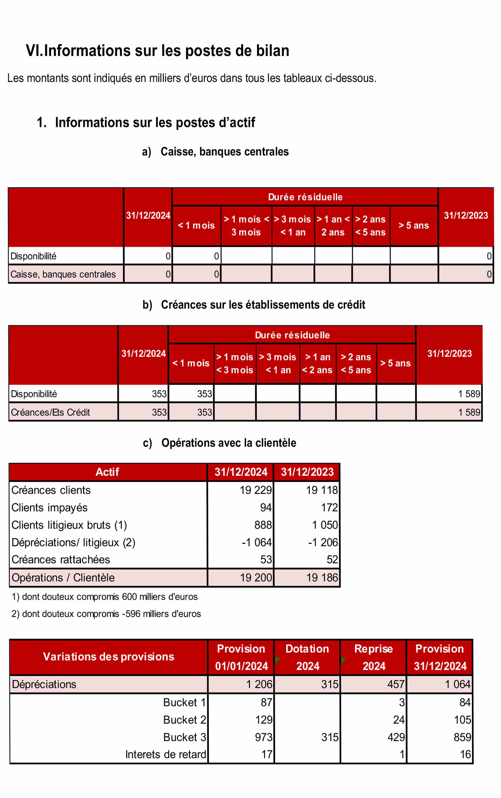 Les opérations avec la clientèle, figurant au bilan au 31 décembre 2024 pour un montant net de 19 200 Milliers d’euros, . Comme indiqué dans le paragraphe « Méthode d’évaluation et de présentation des comptes annuels », alinéa b « opérations avec la clientèle « une provision pour dépréciation est pratiquée lorsque la valeur d’inventaire est inférieure à la valeur comptable.