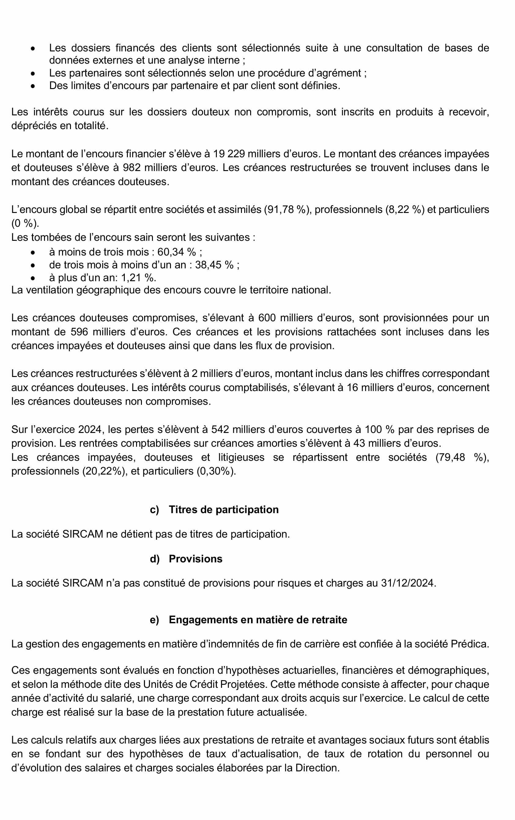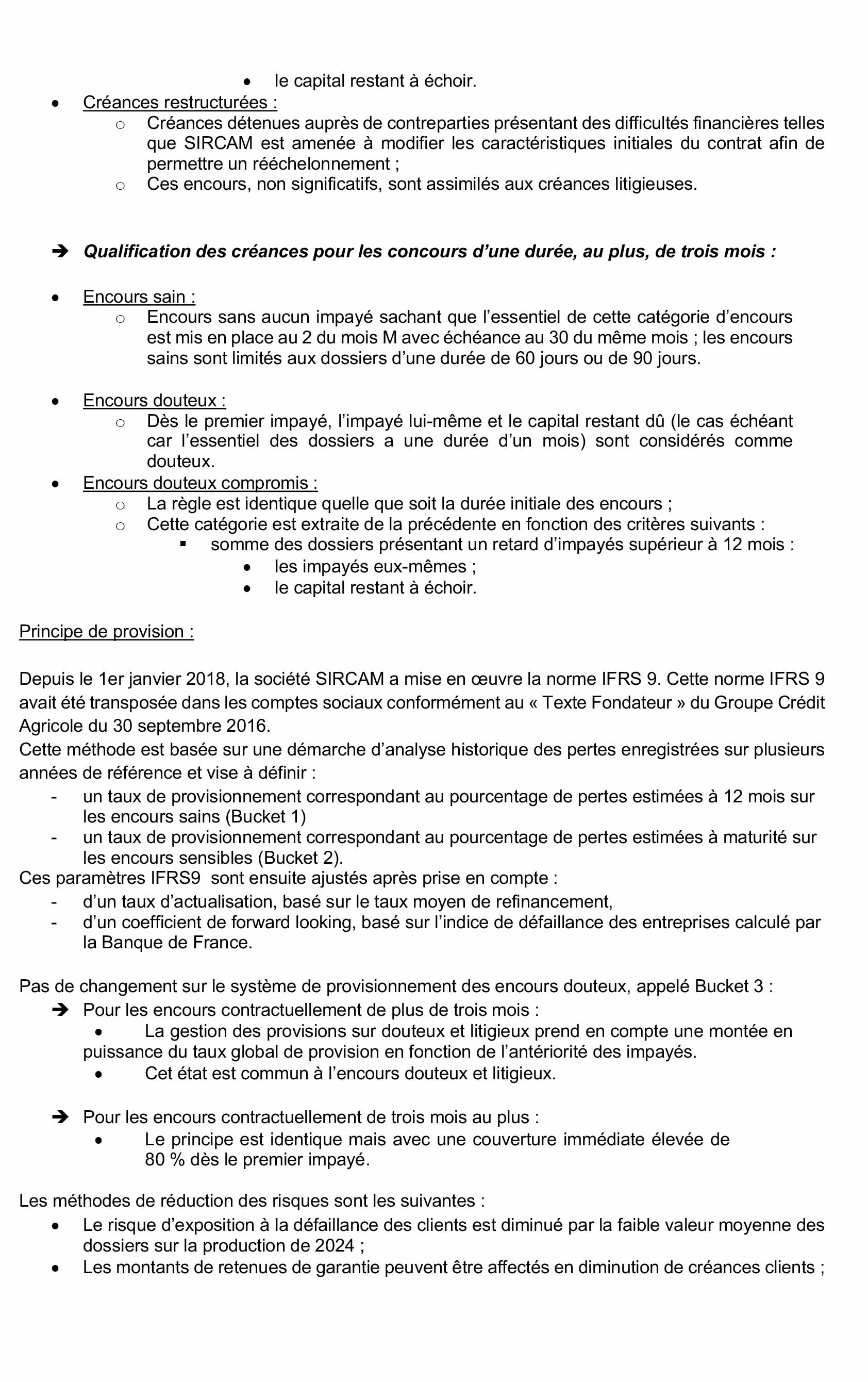 Nous avons procédé à l’appréciation de l’approche retenue par la société SIRCAM, décrite dans le paragraphe « Méthode d’évaluation et de présentation des comptes annuels », alinéa « Opérations avec la clientèle », sur la base des éléments disponibles à ce jour, et mis en œuvre des tests pour vérifier par sondage l’application de cette approche.